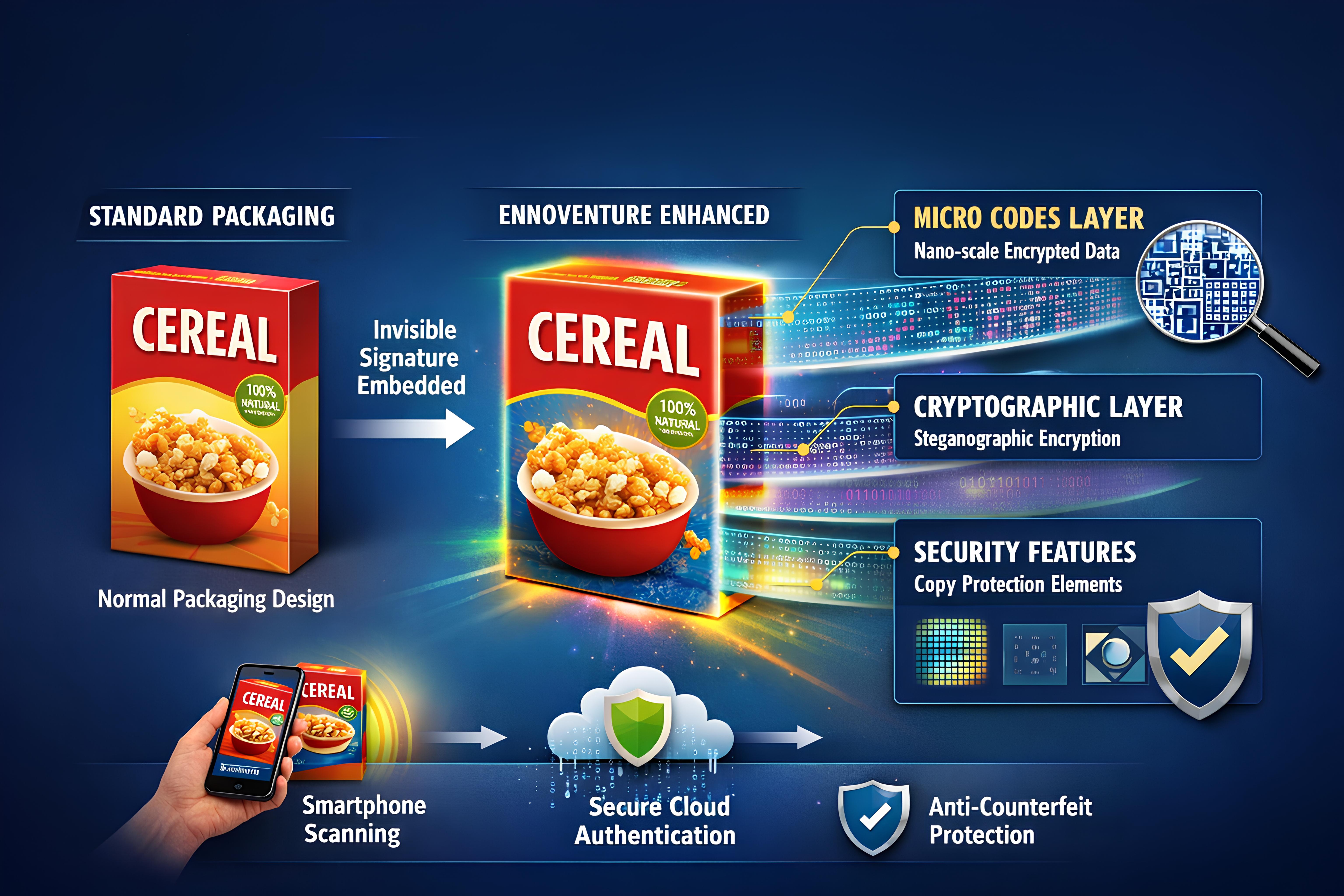 Traditional physical security features continue to play a vital role. Overt features, such as holograms and color-shift inks, are visible to the naked eye and allow for easy visual inspection by inspectors or consumers. Covert features, such as invisible ink or micro-text, require specialized tools to detect and are used for forensic-level verification by brand enforcement teams. While useful, these features can be vulnerable to skilled counterfeiters who may copy physical packaging. Ennoventure circumvents these risks by embedding invisible cryptographic signatures directly into the artwork, which cannot be seen or copied by human counterfeiters.
