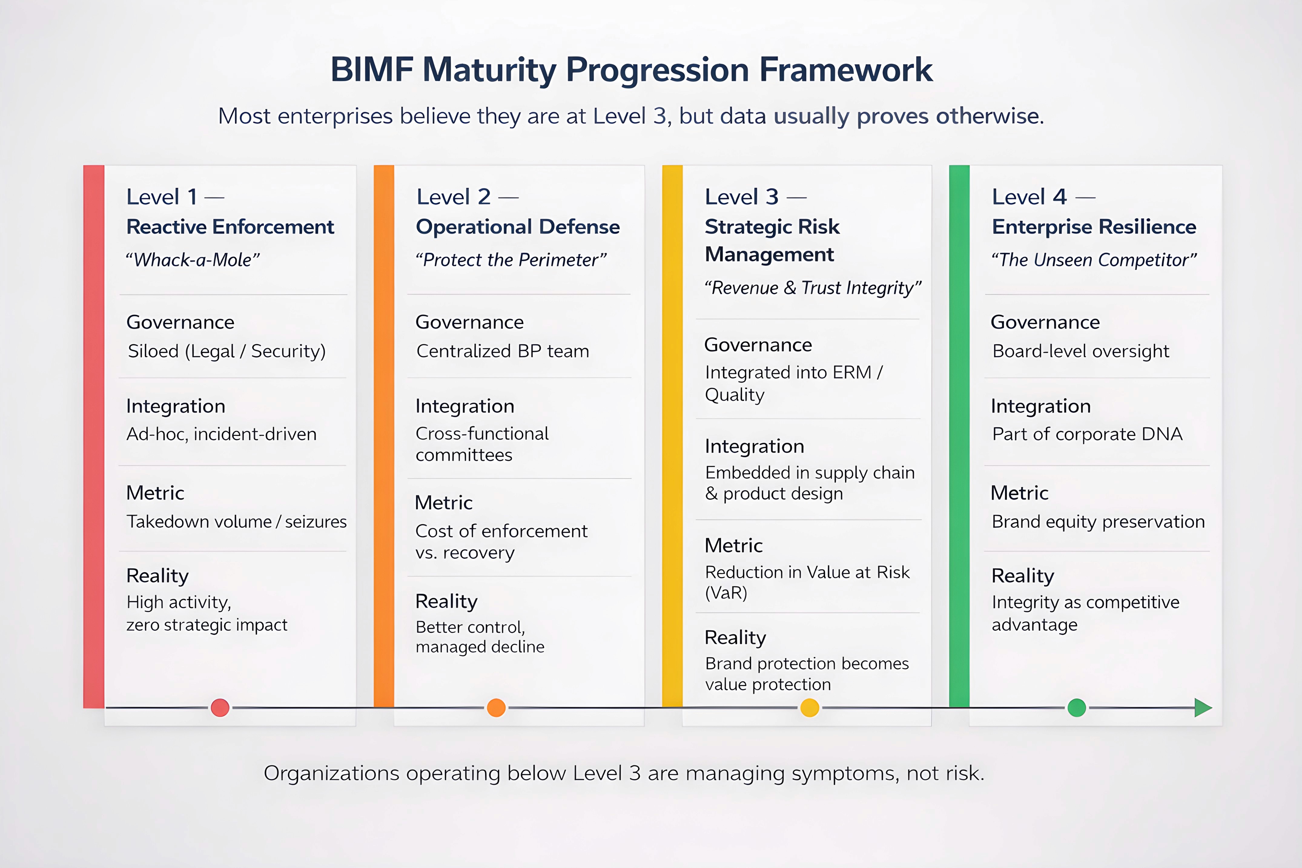 To move beyond the Enforcement Trap, organizations must evolve. We have developed the Brand Integrity Maturity Framework (BIMF) to help C-level leaders assess their current state and chart a path toward resilience.